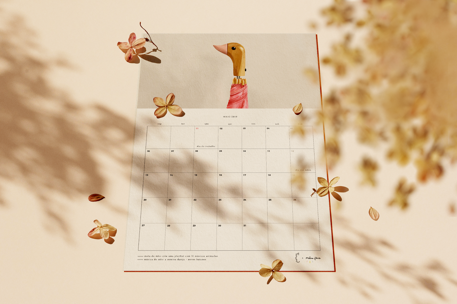 Para 2019, criei um calendário em uma versão "imprima você mesmo". O formato para download inclui 12 páginas mensais com espaço em cada data para você escrever os seus compromissos. Priorizei o design clean e moderno, que é algo que faz toda diferença para mim, não gosto de planejadores com muitas informações visuais, isso acaba atrapalhando o foco e a praticidade - que cá entre nós, é o objetivo principal de um planejador. Então mantive o layout mais limpo possível. São 12 ilustrações diferentes no topo, metas mensais e sugestões de músicas para embalar cada mês do ano.